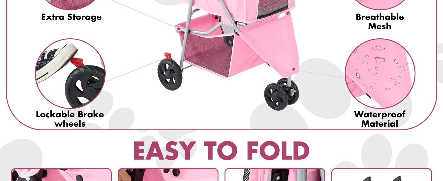 3 Wheels Pet Stroller Dog Jogging with Breathable Mesh Window, Large Storage Basket, Cup Holder